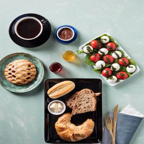 Mozzarella, Pesto - Domates, Tereyağ, Ev reçeli X 2, Nutella, 2 Dilim French Toast, Kruvasan, Zeytinli Ekmek-Domatesli Ekmek,Sade Ekmek, Filtre Kahve veya Çay ile (1 Küçük demlik)